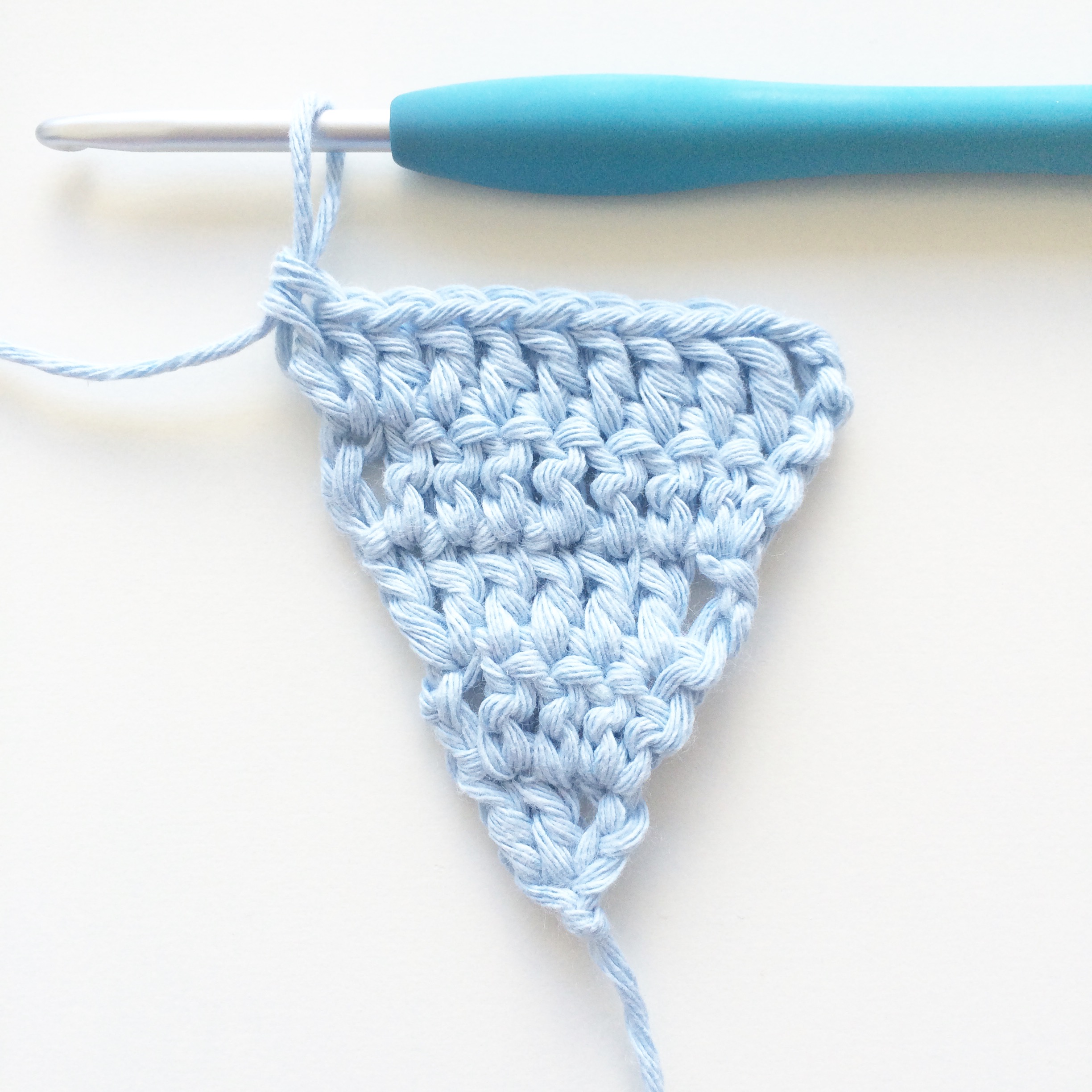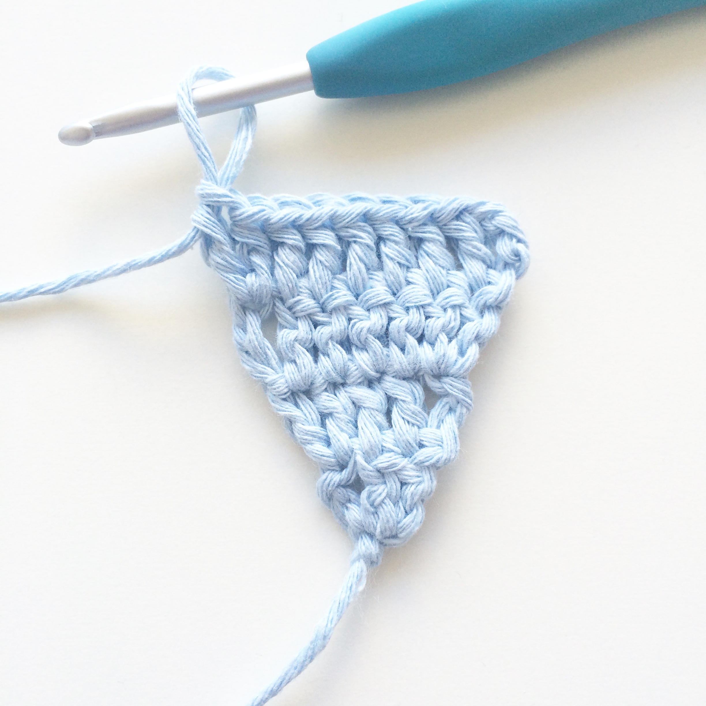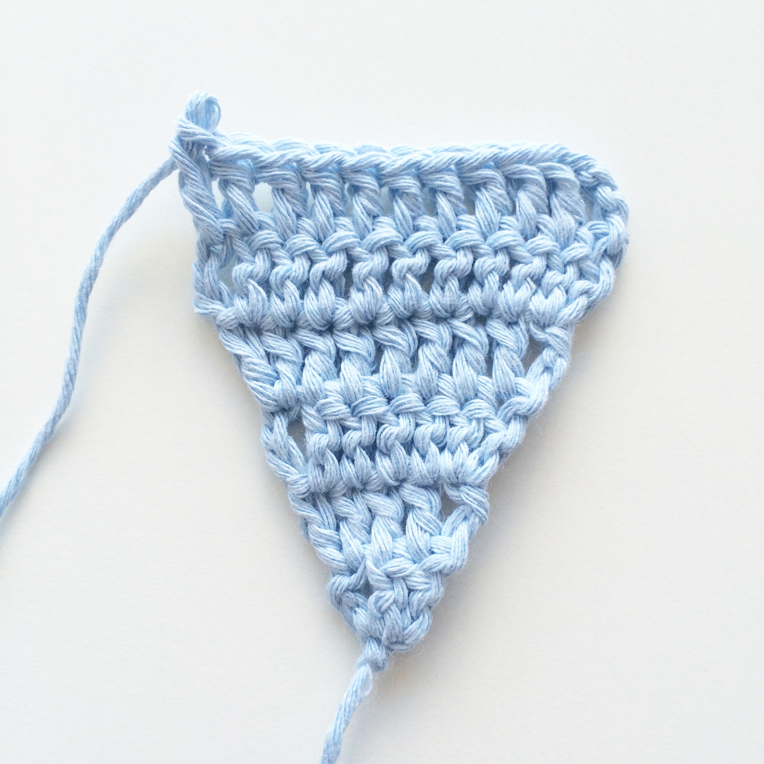Turn work and ch 3. 1 dc in the next 10 sts. There are no increases in the stitch count from this row onwards. (Total 11 dc’s)