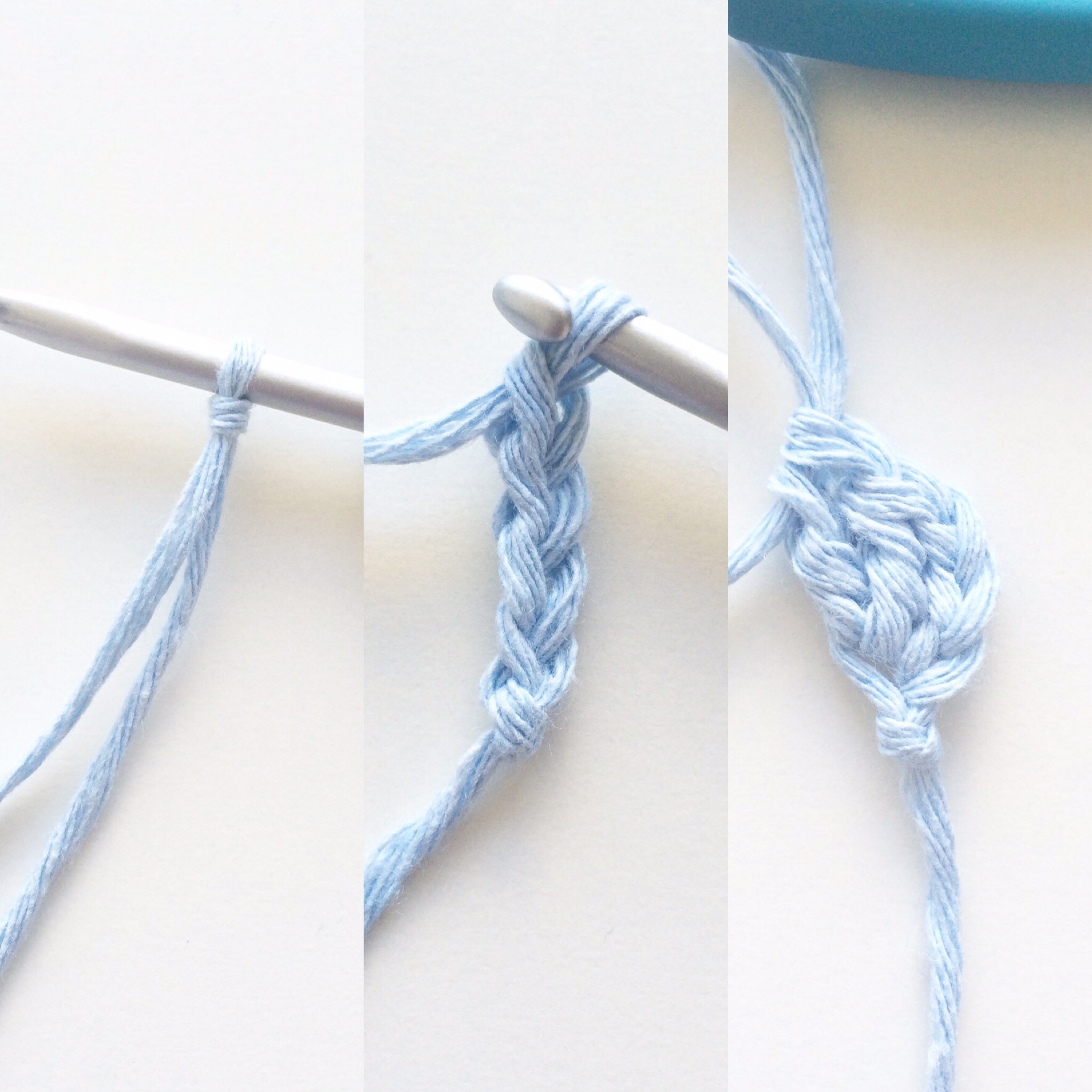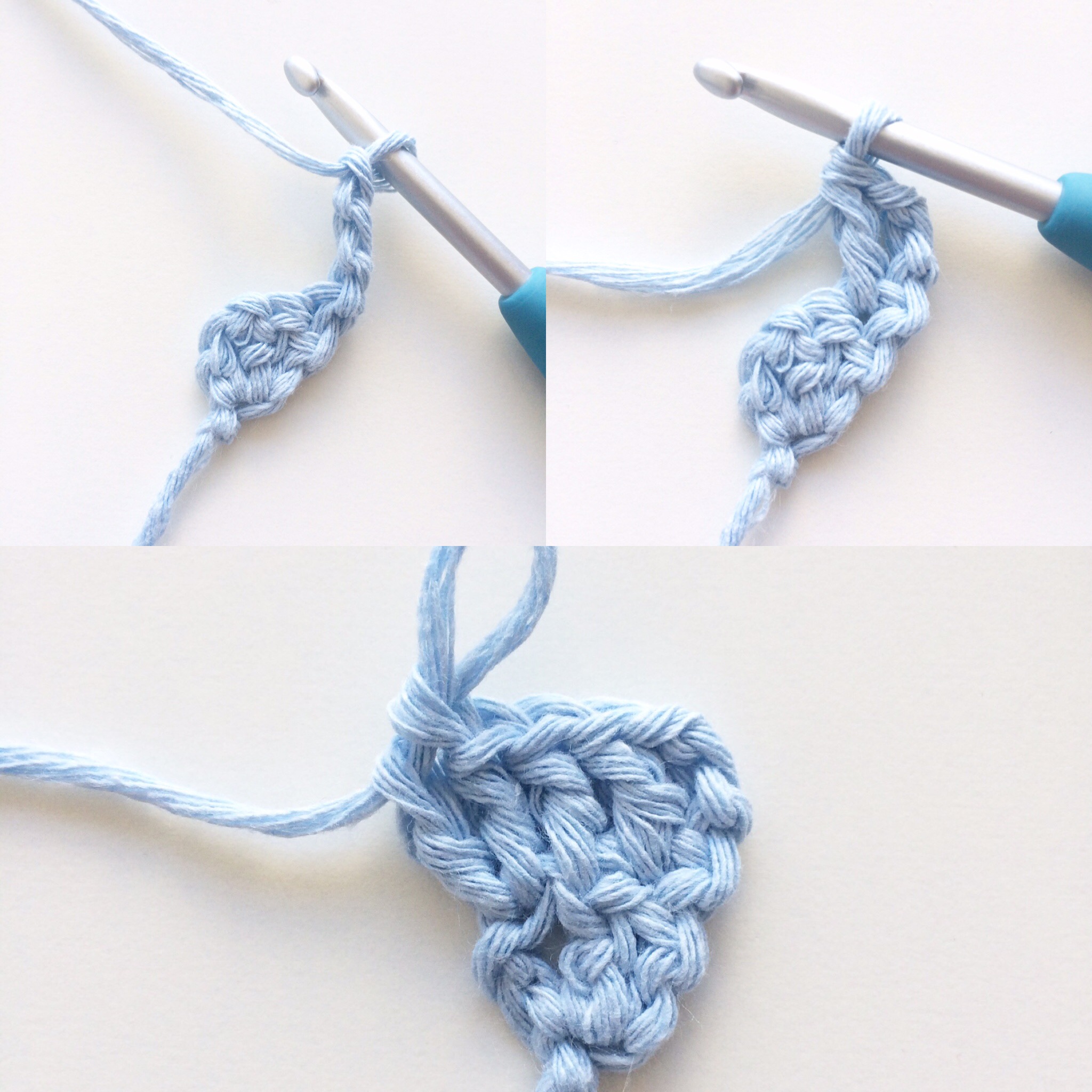 Make a slip knot. Ch 4 and make 2 dc’s in the 4th ch from the hook. (Total 3 dc’s)